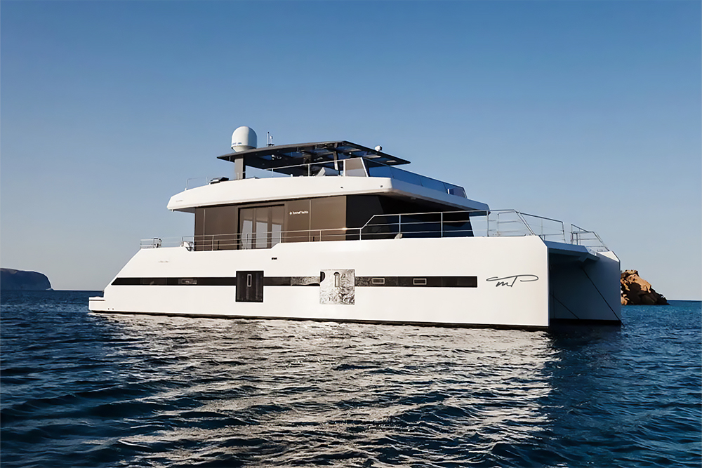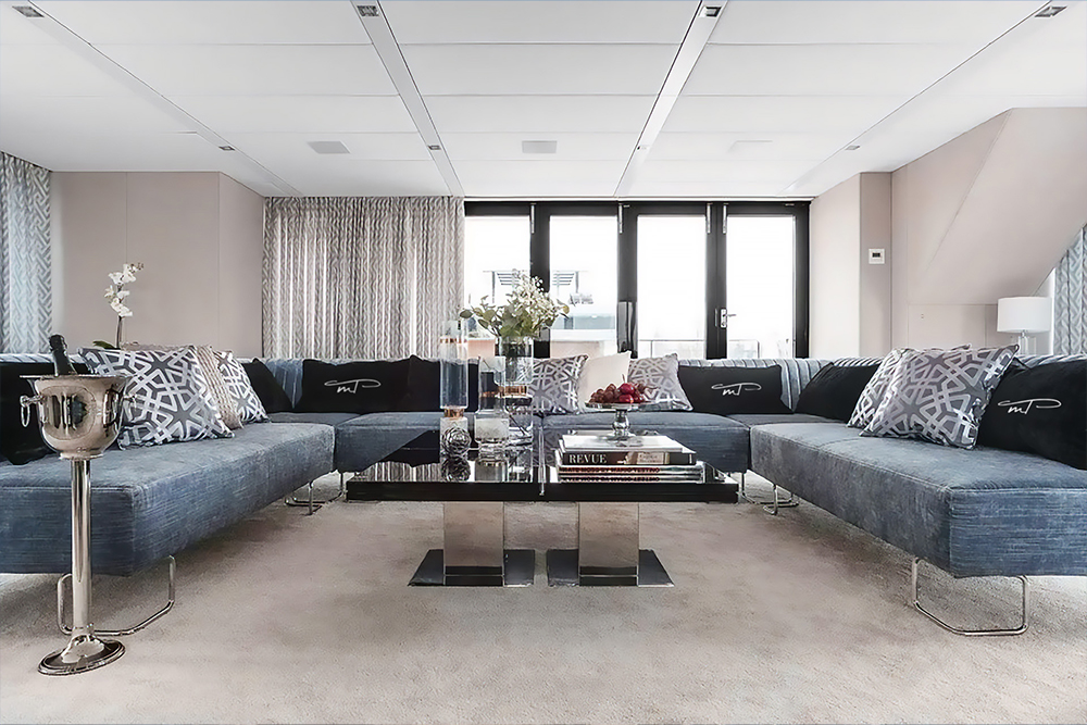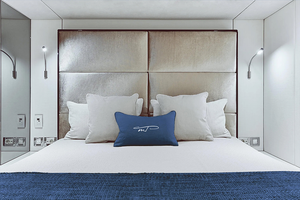 A key element of the identity became the M&T monogram, with a distinctive hierarchy — a subtle lowercase “m” paired with a dominant capital “T.” This typographic contrast added character and uniqueness while remaining understated and luxurious. The color palette was guided by the yacht’s interior concept, spanning contemporary shades of blue from deep navy to light turquoise.