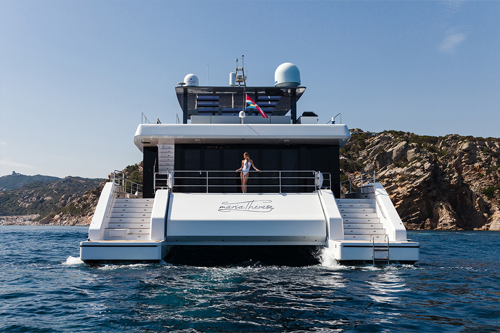 Working closely with the owners, the visual direction was defined by clean forms, restrained elegance, and a refined cursive typographic style. The full name Marie Therese was designed for prominent placement on the garage, while a simplified monogram was developed for the hull, bow, and lifestyle applications such as apparel and onboard textiles.